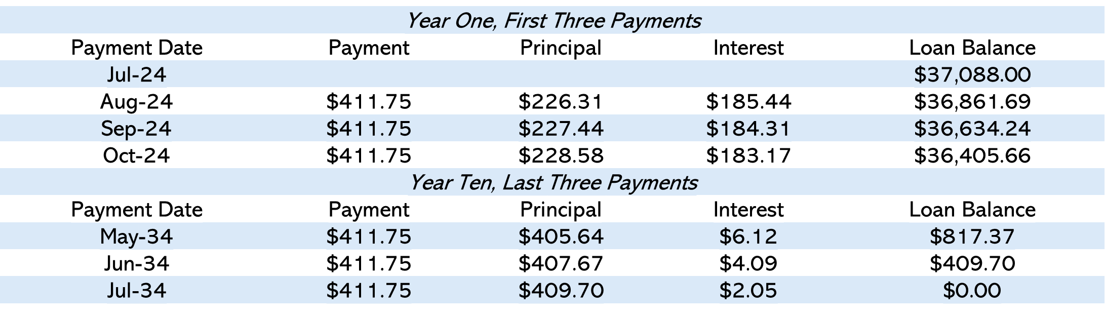 Notice that the “Payment” of $411.75 never changes. Also, the “Loan Balance” decreases by the “Principal” component of the payment. Finally, the “Principal” component makes up a larger and larger share of the “Payment” until the “Loan Balance” reaches $0.